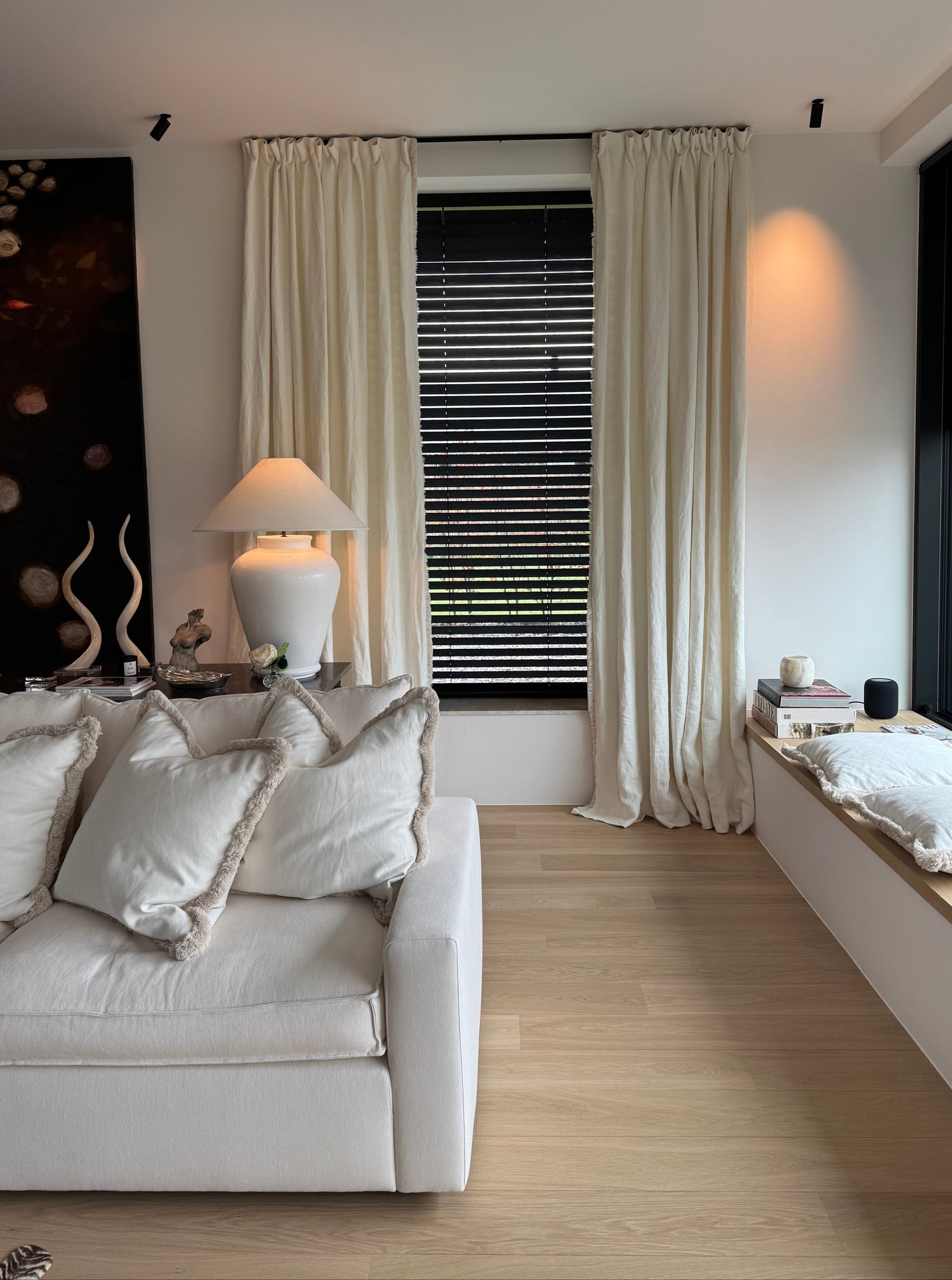 Voor een nieuwbouwwoning in Paterswolde hebben we op maat gemaakte gordijnen geleverd van grof linnen, met een hoogte van 3,20 meter. De grove textuur van het linnen geeft de woning een natuurlijke en luxe uitstraling. Een stijlvol passement tussen de sluitnaden zorgt voor een verfijnde afwerking en een exclusieve look.